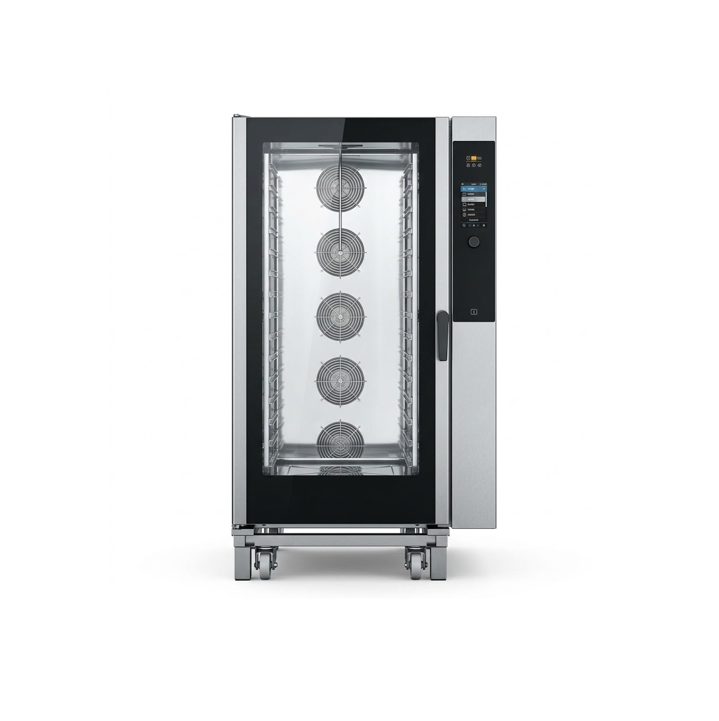 Khoang lò được thiết kế dạng xe đẩy với 20 khay GN1/1, cho phép đầu bếp đưa cả xe khay vào lò một cách nhanh chóng. Thiết kế này giúp tiết kiệm thời gian thao tác và tăng hiệu quả làm việc trong các bếp có công suất lớn.