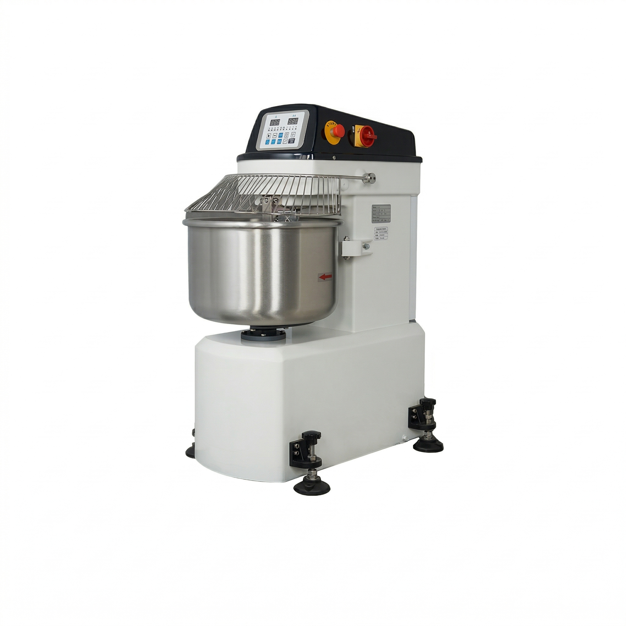 Kích thước máy 600 x 930 x 1190 mm mang lại một vẻ ngoài bề thế và chuyên nghiệp. Máy được trang bị hệ thống lồng bảo vệ inox chắc chắn bao quanh miệng cối trộn bột. Đây là thiết bị an toàn bắt buộc giúp ngăn chặn các tai nạn lao động khi máy đang vận hành ở tốc độ cao. Cảm biến an toàn tích hợp sẽ tự động ngắt điện nếu lồng bảo vệ được nâng lên trong lúc máy đang chạy bảo vệ tuyệt đối cho người vận hành. Các nút bấm điều khiển được thiết kế theo tiêu chuẩn chống nước và chống bụi bột giúp hệ thống điện luôn hoạt động chính xác trong môi trường sản xuất thường xuyên tiếp xúc với bột mì và độ ẩm cao.