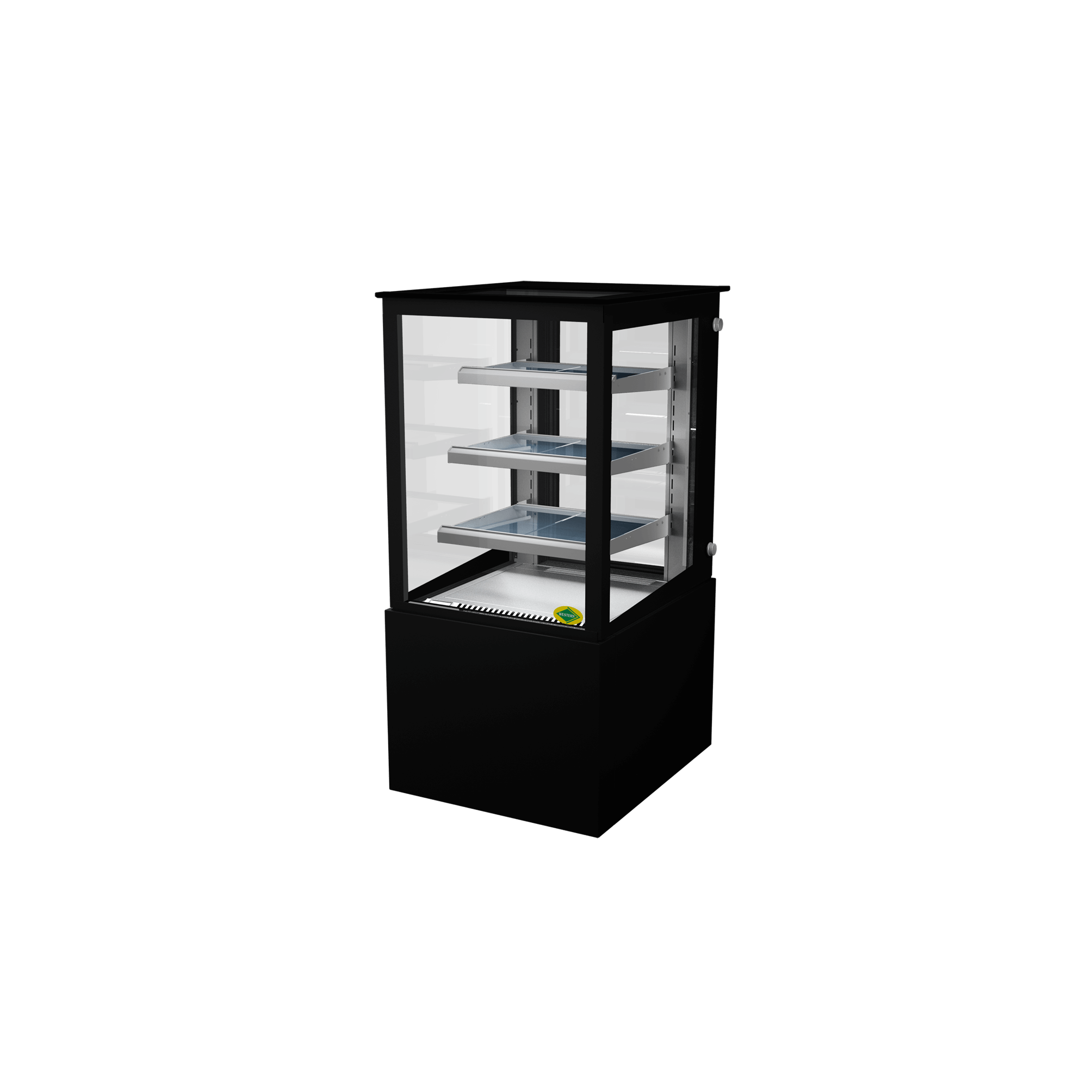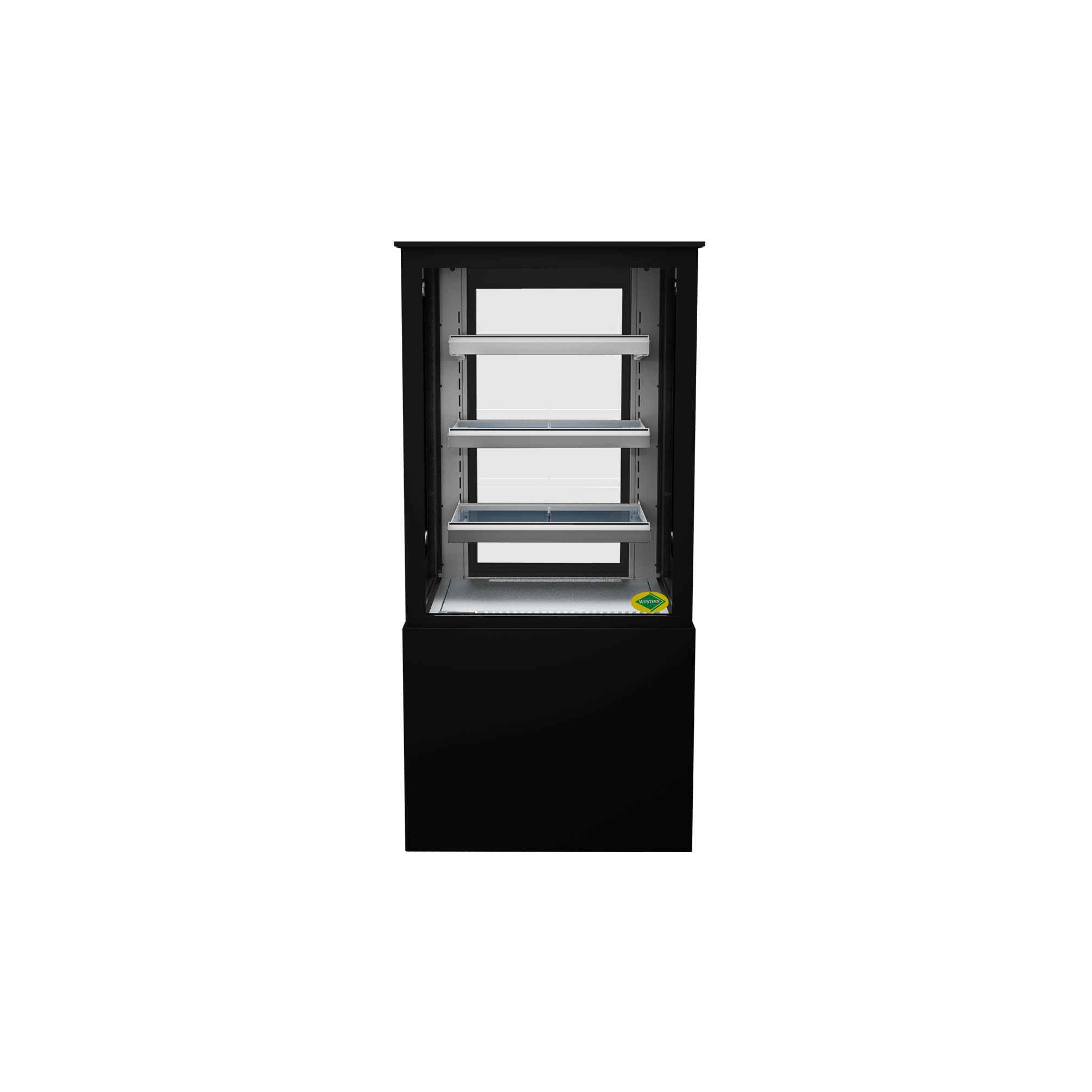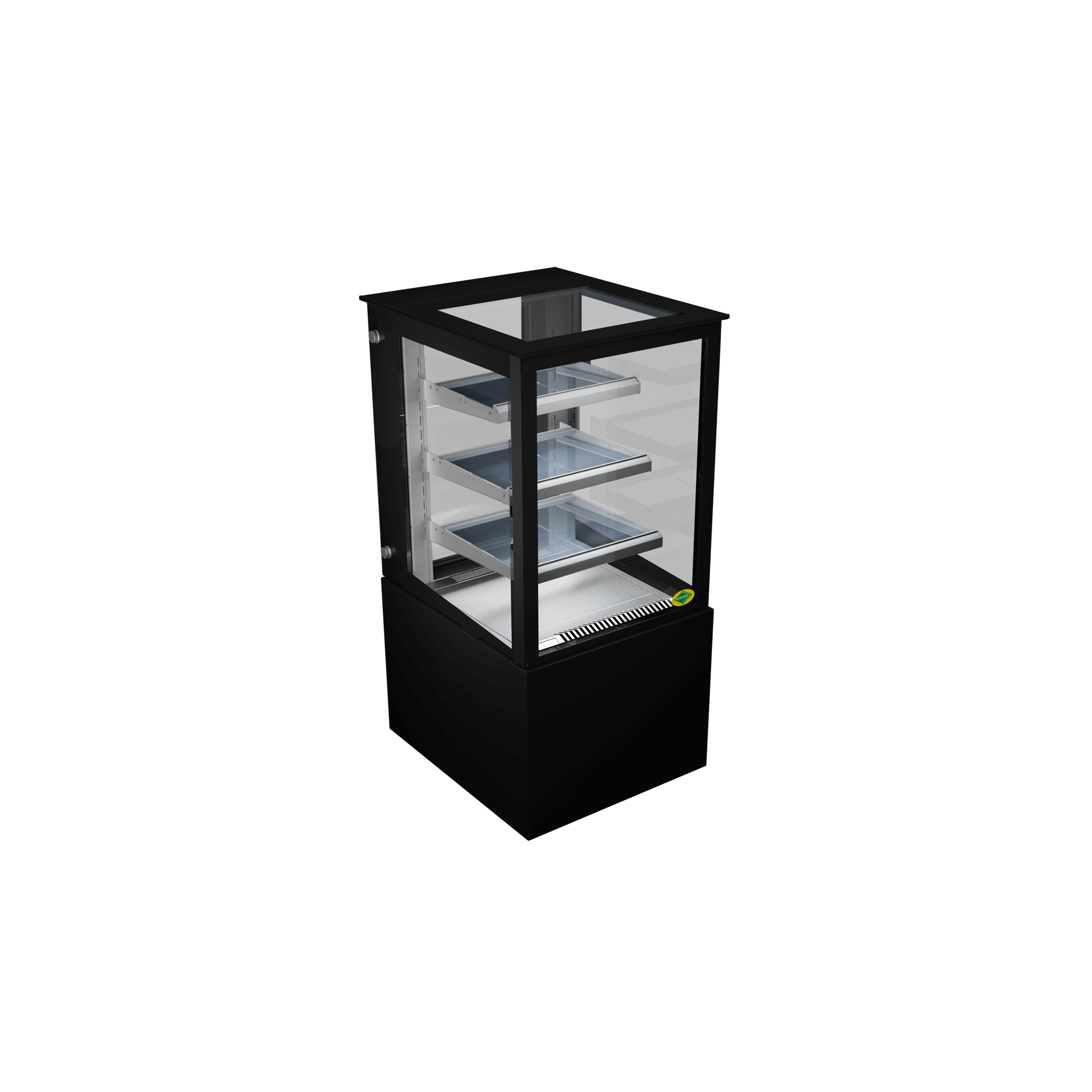 Hệ thống 3 kệ chứa được thiết kế chắc chắn với khả năng chịu tải tốt, cho phép sắp xếp đa dạng từ các ổ bánh sinh nhật kích thước lớn đến các khay bánh nhỏ (petit fours) một cách khoa học. Việc phân chia không gian theo chiều dọc giúp tạo ra hiệu ứng thị giác phân tầng hấp dẫn, kích thích nhu cầu mua sắm của khách hàng ngay từ cái nhìn đầu tiên. Bên trong khoang tủ, các góc cạnh được bo tròn tinh tế không chỉ phục vụ yếu tố thẩm mỹ mà còn giúp quá trình vệ sinh, khử khuẩn định kỳ trở nên đơn giản, đảm bảo tiêu chuẩn an toàn thực phẩm khắt khe nhất trong ngành bánh.
